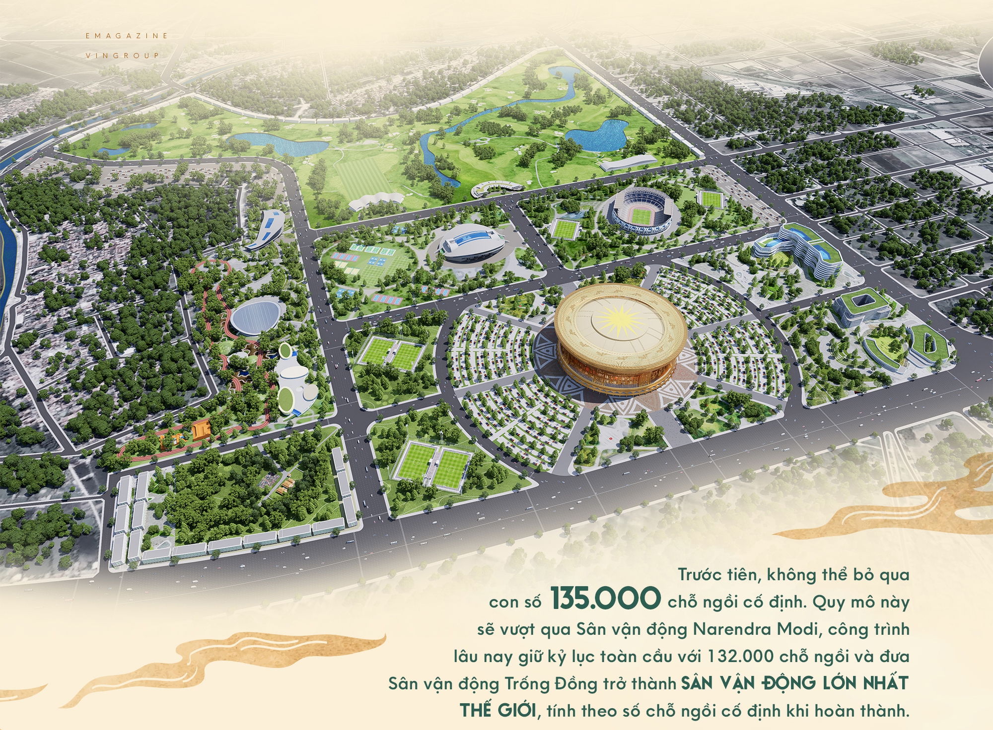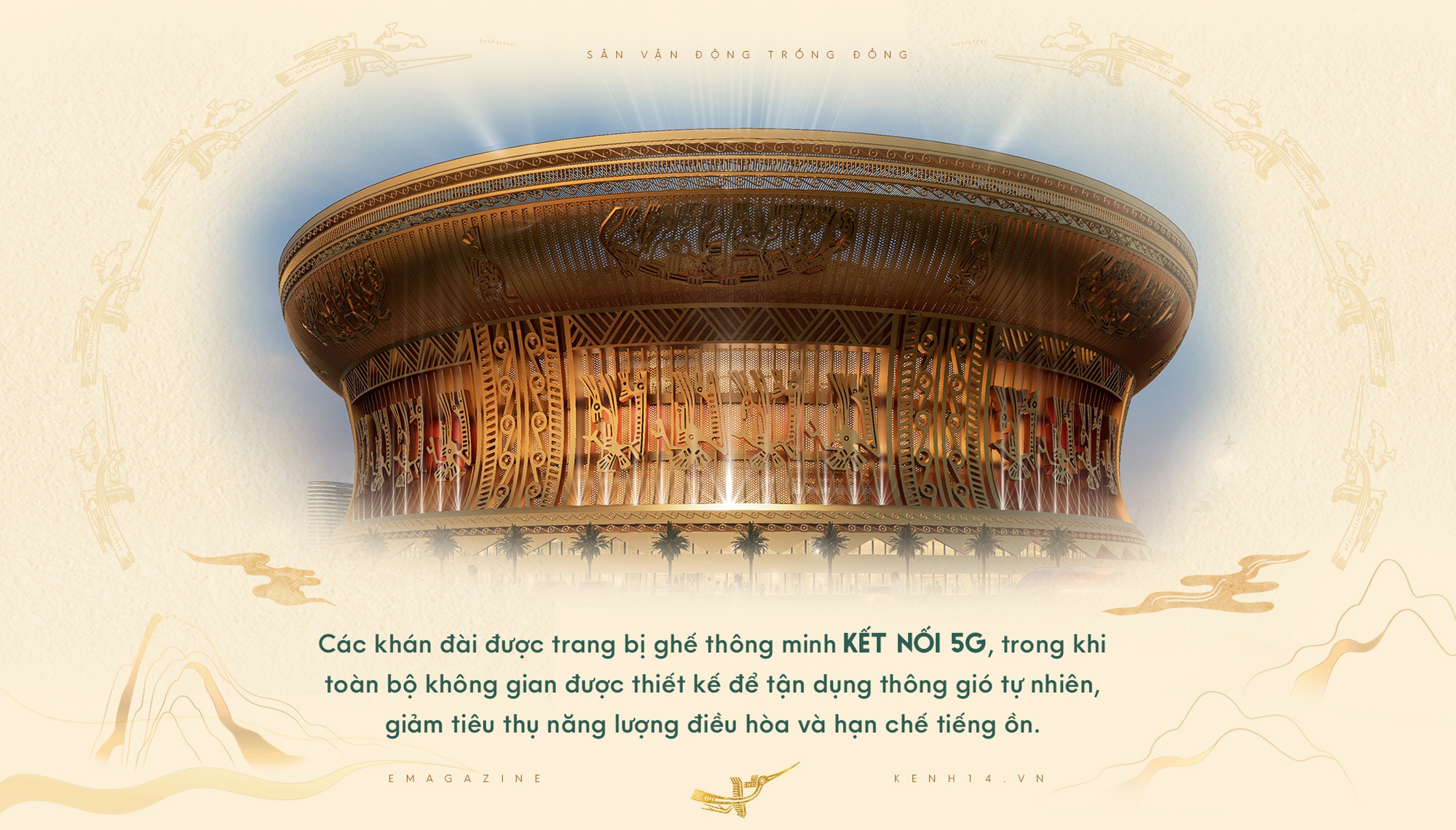 Công trình được thiết kế đạt chuẩn FIFA, sở hữu 2 kỷ lục là có hệ thống mái che đóng mở tự động lớn nhất thế giới và sức chứa chỗ ngồi cố định lớn nhất thế giới, đủ điều kiện tổ chức các sự kiện thể thao, văn hóa tầm cỡ quốc tế lớn như World Cup, Olympic… Nhưng vượt lên trên những con số kỹ thuật hay kỷ lục toàn cầu, điều khiến Sân vận động Trống Đồng trở nên đặc biệt nằm ở kiến trúc được thiết kế mô phỏng trống đồng Đông Sơn - biểu tượng văn hóa từ ngàn đời xưa của người Việt.