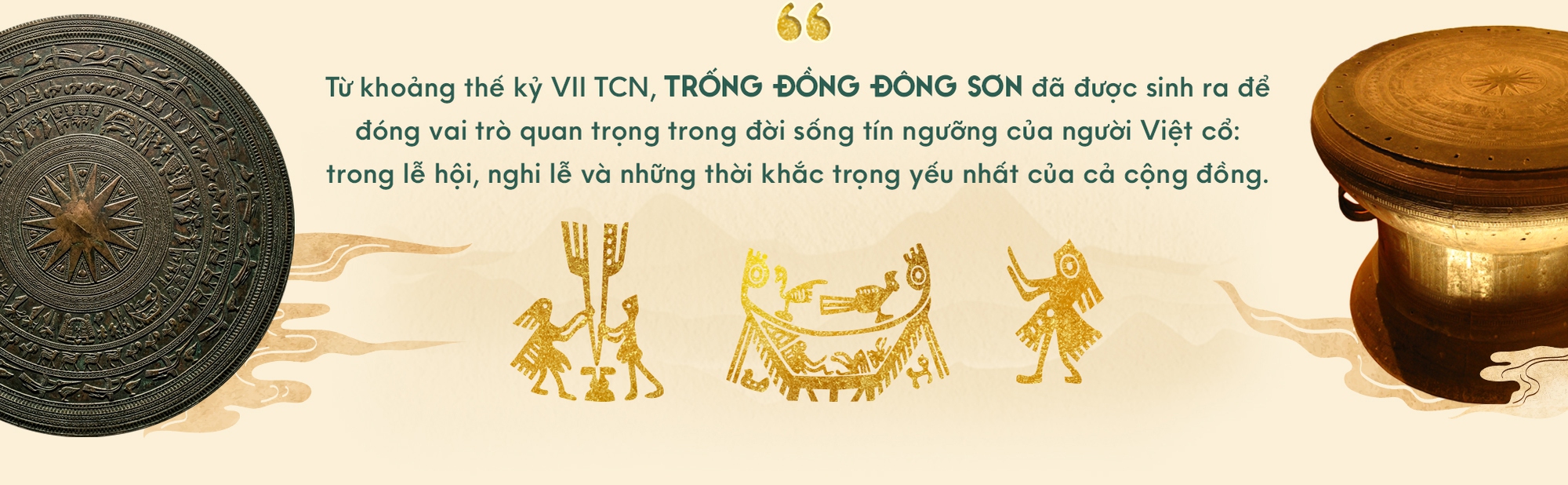 Tiếng trống khi ấy vang lên để kết nối con người với nhau, để gọi mưa thuận gió hòa, để mở đầu lễ hội, để khơi dậy tinh thần chiến đấu của cả cộng đồng trong những thời khắc quan trọng của làng xã và bộ lạc. Trống đồng tồn tại như một trung tâm năng lượng gắn kết con người, thiên nhiên và niềm tin cùng hội tụ. Mỗi hồi trống vang lên là một lời khấn nguyện gửi đến vũ trụ, một mệnh lệnh thiêng liêng của thủ lĩnh đối với dân chúng.