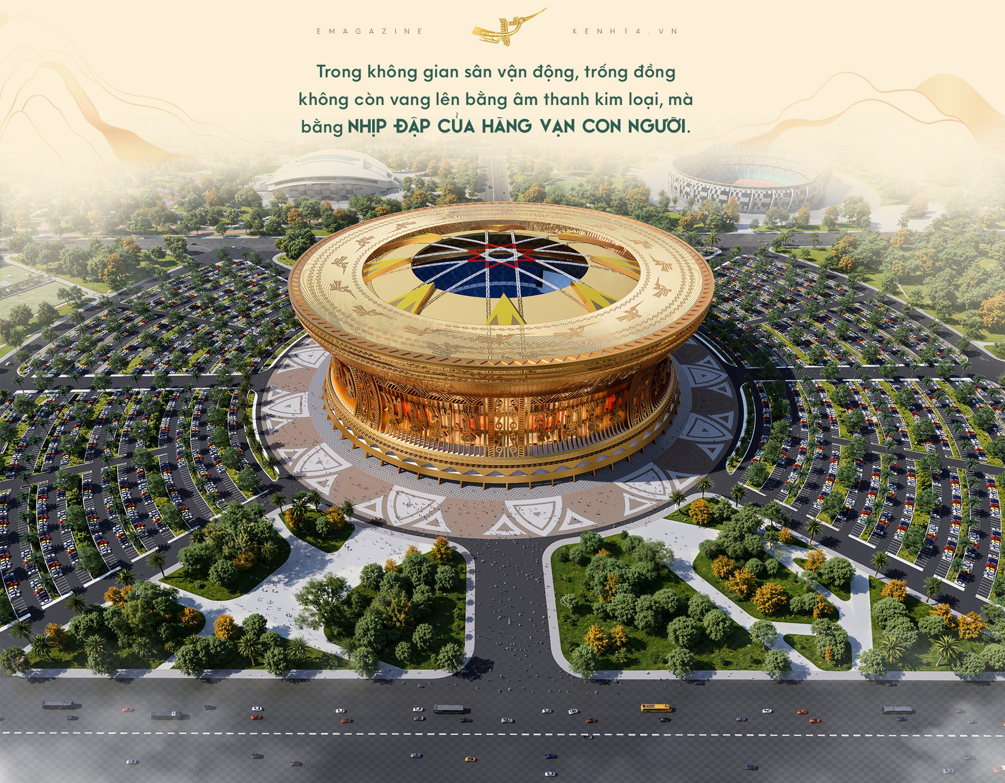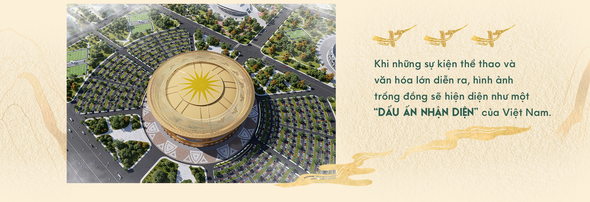Chính tại điểm giao thoa ấy, hình tượng trống đồng tìm được một “đời sống” mới trong kiến trúc. Việc lựa chọn thiết kế trống đồng cho sân vận động không phải là sự gán ghép mang tính biểu tượng bề mặt, mà là sự tương đồng sâu sắc về chức năng văn hóa: cùng là trung tâm quy tụ, cùng là nơi dẫn dắt cảm xúc tập thể, cùng mang tinh thần cộng đồng làm cốt lõi.