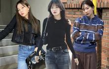 Công thức denim-on-denim chưa bao giờ lỗi mốt. Sự kết hợp này trẻ trung, phảng phất nét retro. Chỉ cần sơ vin gọn gàng, Seulgi có được bộ cánh sang xịn mịn ngay cả khi không tô điểm phụ kiện quá cầu kỳ. Kiểu tóc suôn thẳng rất phù hợp với bộ cánh hiện đại. Muốn cộng thêm điểm thanh lịch cho outfit, chị em có thể nhấn nhá thắt lưng da và đi giày cao gót mũi nhọn.