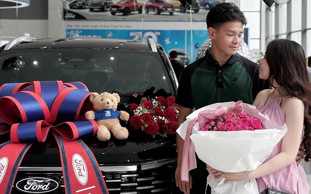 Mới đây, tuyển thủ trẻ của ĐT U23 Việt Nam và ĐT Việt Nam Bùi Vĩ Hào - vừa khiến dân mạng chú ý khi đăng ảnh nhận xế hộp mới tại showroom ô tô. Chiếc xe Ford SUV được trang trí đẹp mắt với bóng bay, gấu bông và nơ lớn đỏ - xanh nổi bật. Trong khung hình, Bùi Vĩ Hào xuất hiện giản dị mà phong độ, còn vợ anh - Thảo Vy 0 diện váy hồng pastel nhẹ nhàng, tay ôm bó hoa lớn. Cả hai nhìn nhau bằng ánh mắt ngọt ngào khiến dân tình thả tim rần rần. Hội tuyển thủ Việt Nam cũng ồ ạt vào bình luận chúc mừng hạnh phúc viên mãn của chàng tiền đạo sinh năm 2003.
