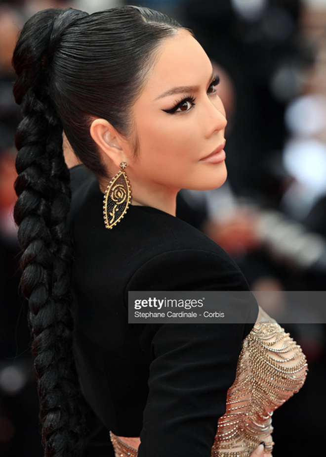 Trước Hương Giang vài ngày, Lý Nhã Kỳ đã có tới 4 ngày phô trương thanh thế trên thảm đỏ Cannes với chi phí đầu tư cho trang phục + phụ kiện lên tới 50 tỷ. Nữ diễn viên ra sân chơi quốc tế đổi sang làn da nâu rám nắng rắn rỏi, makeup tông nude hơi hướng phương Tây. Ống kính Getty Images không hề "dìm" sắc vóc Lý Nhã Kỳ, ngoại hình cô vẫn đẹp đâu ra đấy với váy áo lồng lộn và lớp trang điểm mịn lì chỉn chu.