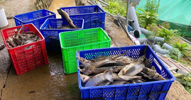 Khu vực nuôi cá tầm bị nước, đất đỏ từ vụ sạt lở tràn xuống khiến cá chết hàng loạt