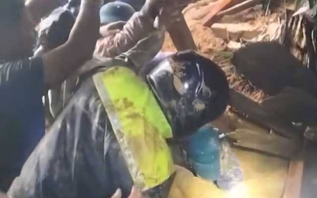 Lực lượng chức năng bới trong lớp bùn đất để đưa nạn nhân ra ngoài.