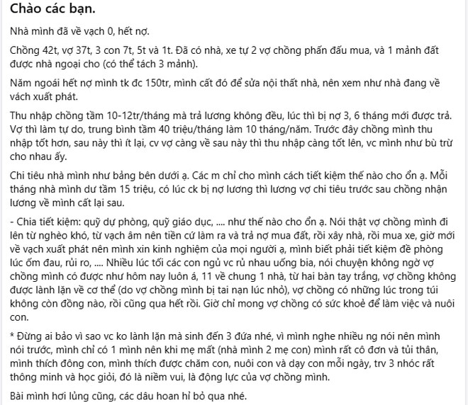 Ngay sau khi chia sẻ câu chuyện tài chính của gia đình mình lên mạng xã hội, bài viết của chị nhanh chóng thu hút sự chú ý lớn. Không chỉ dừng lại ở hành trình "thoát nợ", nhiều người đặc biệt quan tâm đến cách chi tiêu và quản lý tiền bạc của gia đình 5 người này.