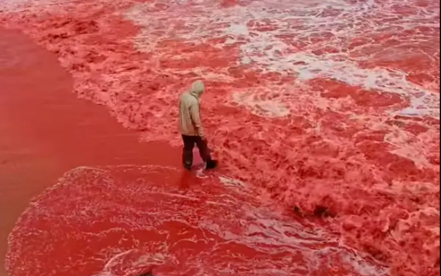 Những bức ảnh về bãi biển nhuộm đỏ như máu đã lan truyền rộng rãi. (Ảnh: NYP)