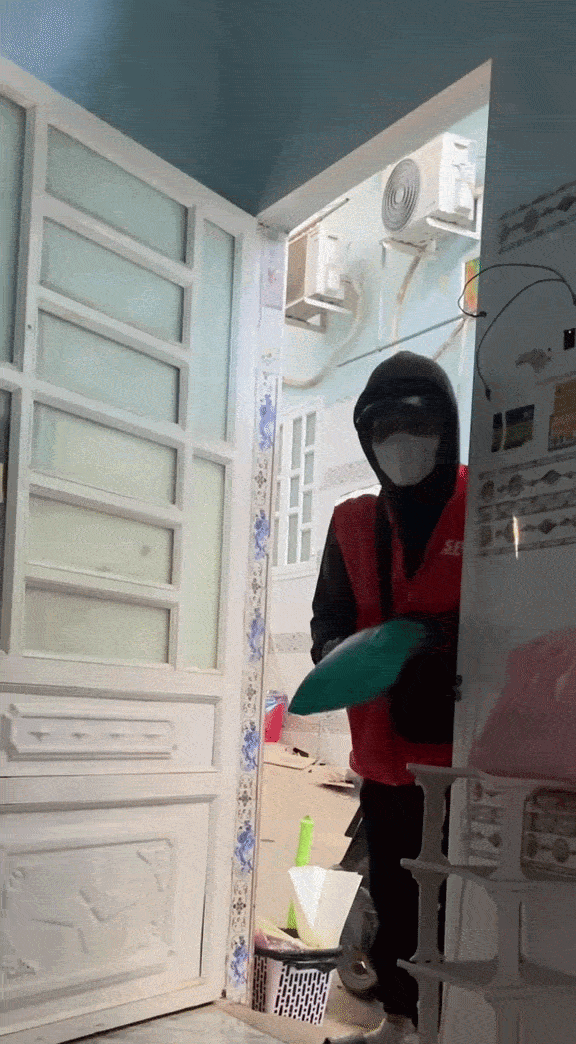 Cánh cửa ban đầu chỉ hé mở, sau đó được đẩy rộng hơn. Nam shipper đứng bên ngoài đọc to: “Đơn hàng 118 nghìn nè”. Từ bên trong, nữ khách hàng chỉ kịp đưa tay ra nhận.