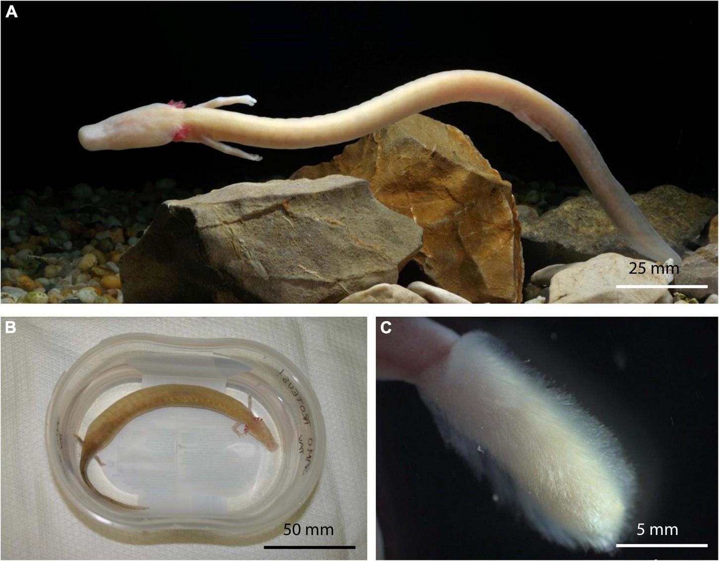 Sinh vật này sở hữu tứ chi rất nhỏ bé, trong đó chi trước chỉ có ba ngón và chi sau hai ngón - một điểm khác biệt lớn so với cấu trúc bốn ngón và năm ngón của các loài lưỡng cư thông thường. Phần đuôi của chúng có một lớp vây mỏng, kết hợp cùng hệ thống mang ngoài màu đỏ bao quanh cổ, thoạt nhìn trông rất giống với bờm rồng.
