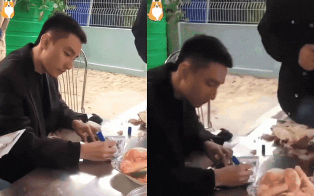 Trên bàn còn nguyên đĩa bưởi đang bóc dở nhưng anh chàng vẫn nhiệt tình ký tặng các fan