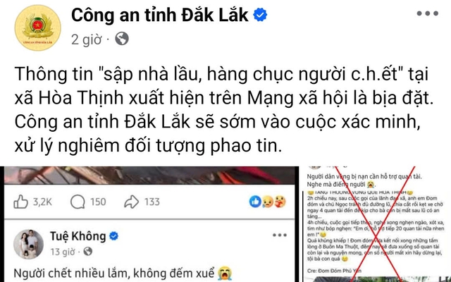Lãnh đạo Phòng tham mưu Công an tỉnh Đắk Lắk cho biết thông tin xuất hiện trên mạng xã hội về số người thương vong tại xã Hòa Thịnh là bịa đặt. Công an tỉnh Đắk Lắk sẽ xử lý nghiêm những người đưa thông tin sai sự thật, gây hoang mang dư luận.