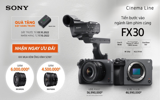 Máy quay Sony FX30 đang được bán tại Việt Nam từ ngày 18/10/2022 với mức giá cho thân máy là 46.990.000 đồng và 56.990.000 đồng cho thân máy kèm bộ phận tay cầm XLR.