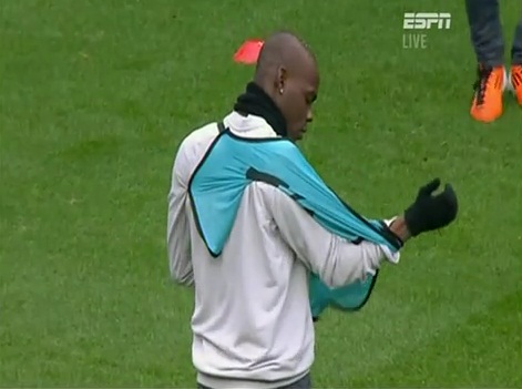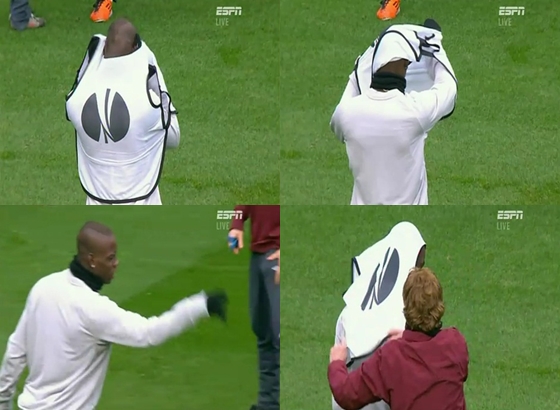 Trong khi đang khởi động trước trận đấu, Mario Balotelli được yêu cầu mặc chiếc áo tập màu trắng để tiến hành màn “làm nóng” như thường lệ. Tuy nhiên, không hiểu sao “bad boy” người Ý không tài nào thực hiện đươc công việc… dễ hơn ăn kẹo này.