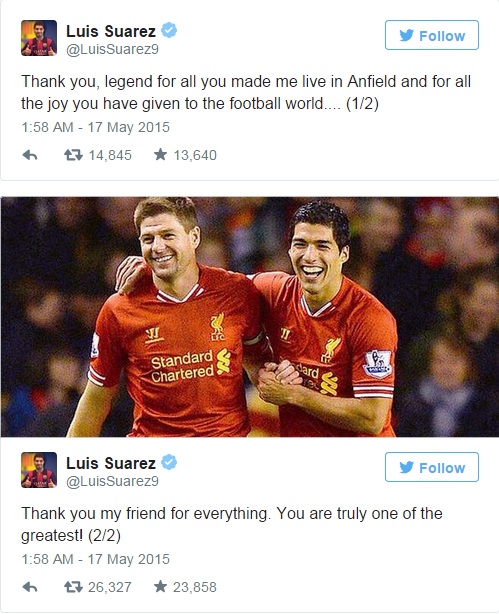 Trong khi đó, Luis Suarez cũng gửi lời chia tay và cảm Gerrard: “Cảm ơn anh, một huyền thoại vì những gì anh đã làm với tôi ở Anfield và vì niềm vui anh đã mang đến cho bóng đá thế giới. Cảm ơn người bạn của tôi vì mọi thứ. Anh là một trong những cầu thủ lớn nhất thế giới.”
