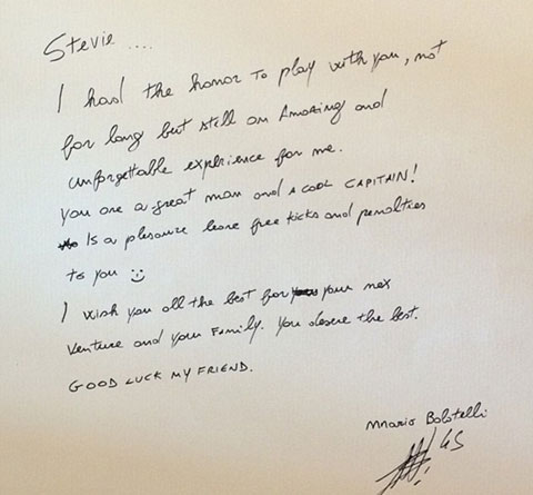 Trong khi đó, với nét chữ nguệch ngoạc, vẫn còn sai lỗi ngữ pháp, Balotelli cũng gửi tới Steven Gerrard một bức thư đầy cảm động.