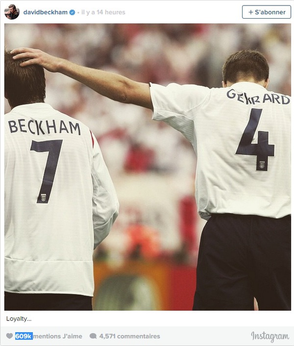 Trên trang Instagram cá nhân, David Beckham chia sẻ tấm hình anh cùng với Gerrard khoác chung màu áo ĐT Anh kèm dòng status ngắn gọn với hai từ “trung thành”.