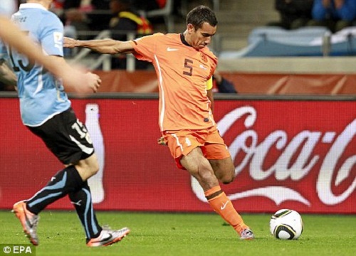 Những phút tiếp theo, thế trận có phần nghiêng về Hà Lan. Uruguay trở về chiến thuật phòng ngự phản công lợi hại. Bất ngờ xảy ra ở phút 20 khi các học trò của HLV Van Bert Marwijk có bàn mở tỷ số 1-0. Trong tình huống lên tham gia tấn công, đội trưởng Van Bronckhorst tung ra cú sút hiểm hóc từ khoảng cách hơn 30m. Bóng đi vào góc xa khung thành khiến thủ môn Muslera dù bay người hết cỡ cũng không thể cản phá.