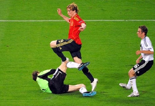 Đội tuyển Đức vẫn với truyền thống quen thuộc, họ vẫn lạnh lùng chịu đựng những pha tấn công của Tây Ban Nha nhưng vẫn không quên đưa ra những đòn phản công hết sức sắc sảo làm thót tim người hâm mộ xứ sở bò tót. Không có Muller nhưng hành lang cánh phải của Đức vẫn hoạt động hiệu quả khi Lahm thỉnh thoảng dâng cao để kết hợp với Ozil, Trochowski và Klose. Phút cuối hiệp 1, Klose chọc khe tinh tế để Ozil thâm nhập khu cấm địa của Tây Ban Nha nhưng Ramos đã kịp lui về để ngăn chặn cú sút của tiền vệ này.