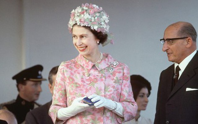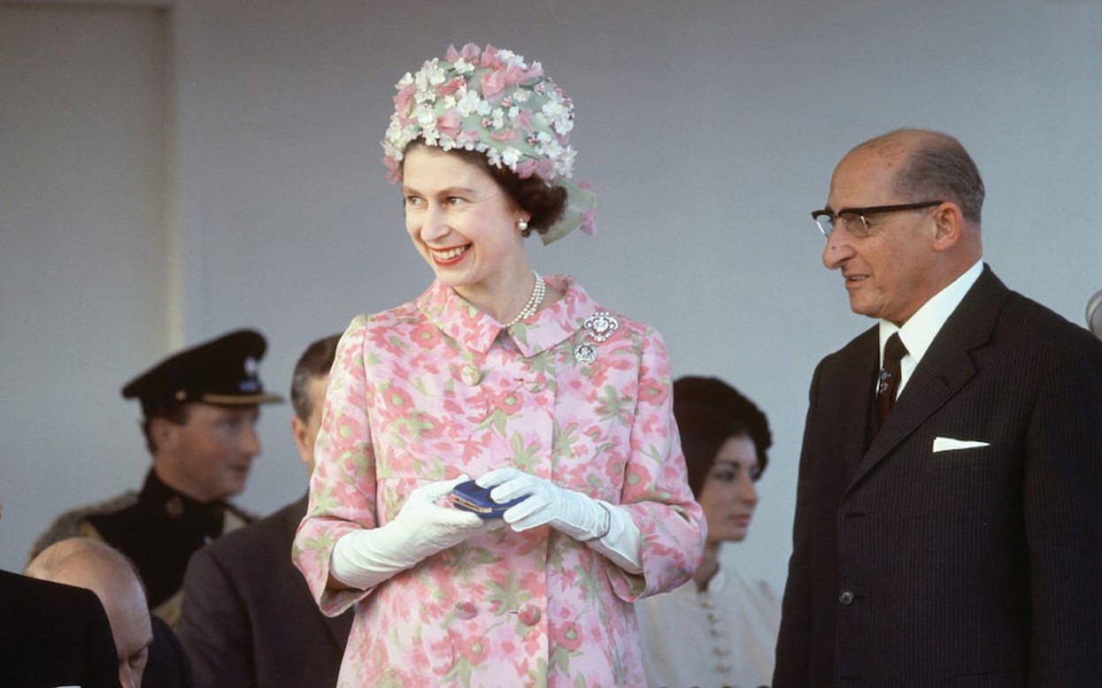 Nữ hoàng Elizabeth II mặc áo khoác Hardy Amies in hoa màu hồng và xanh lá cây cùng với mũ kiểu mũ bơi cùng màu ở Malta, tháng 11 năm 1967. Nguồn ảnh: Reginald Davis/Shutterstock