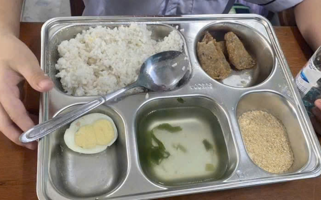 Mới đây mạng xã hội xôn xao trước hình ảnh suất cơm bán trú của học sinh tiểu học có phần đạm bạc. Theo hình ảnh, suất ăn gồm 1 phần cơm trắng, 1 quả trứng luộc, 3 miếng chả nhỏ, 1 ít muối vừng và 1 chút nước canh rau.