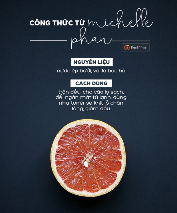 Toner (nước hoa hồng) là bước không thể thiếu sau khi rửa mặt. Nước hoa hồng giúp cân bằng độ Ph trên da - yếu tố quan trọng cho một làn da đẹp, cũng như làm sạch sâu và thu nhỏ lỗ chân lông. Michelle Phan đã công nhận nước bưởi ép có công dụng không kém các loại toner đắt tiền, đặc biệt công thức này rất hợp với các bạn da dầu mụn đấy!