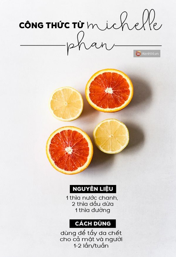 Chỉ cần trộn nước chanh với đường là bạn đã có ngay một loại tẩy da chết "đa-zi-năng". Công thức này có thể dùng cho cả mặt và người, nhưng bạn nhớ là massage nhẹ tay thôi nhé! Ngoài ra, với tất cả sản phẩm dưỡng da có chiết xuất từ các loại quả chua, có múi, bạn nên lưu ý chống nắng cẩn thận sau khi sử dụng.
