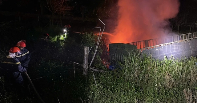 Vụ tai nạn khiến chiếc xe đầu kéo lao xuống vệ đường rồi bốc cháy dữ dội. Phần đầu xe bị lửa thiêu rụi, hư hỏng nặng.