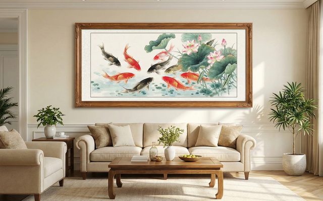 Khi ngắm nhìn một bức tranh "cửu ngư quần hội" treo trong không gian phòng khách ấm cúng, cảm giác đầu tiên mang lại cho người xem thường là sự thư thái, bình yên. Hình ảnh chín chú cá chép bơi lội tung tăng trong làn nước trong xanh, bên cạnh là những đóa sen nở rộ tạo nên một khung cảnh sinh động mà tĩnh tại. Nhưng người giàu, họ không chỉ nhìn tranh bằng mắt, họ "đọc" tranh bằng cái đầu của những người am hiểu về quy luật vận hành của tài phú. Trong văn hóa Á Đông, mỗi chi tiết trong bức tranh đều mang một tầng ý nghĩa phong thủy sâu sắc, bắt đầu ngay từ cái tên.