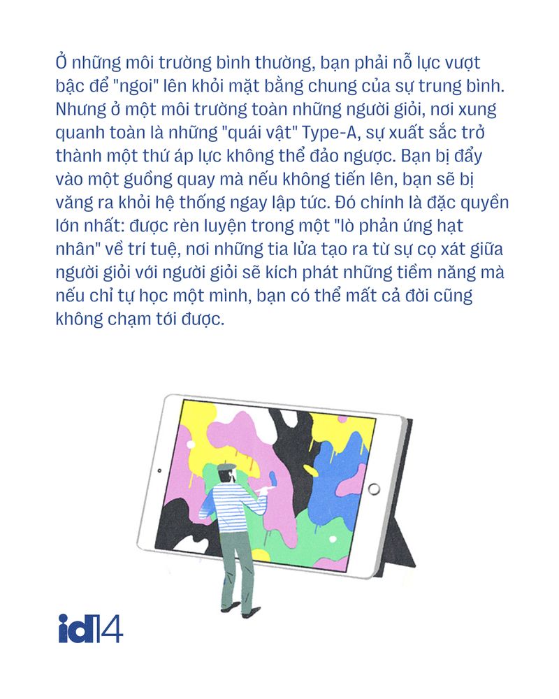 Ở những môi trường bình thường, bạn phải nỗ lực vượt bậc để "ngoi" lên khỏi mặt bằng chung của sự trung bình. Nhưng ở một môi trường toàn những người giỏi, nơi xung quanh toàn là những "quái vật" Type-A, sự xuất sắc trở thành một thứ áp lực không thể đảo ngược. Bạn bị đẩy vào một guồng quay mà nếu không tiến lên, bạn sẽ bị văng ra khỏi hệ thống ngay lập tức. Đó chính là đặc quyền lớn nhất: được rèn luyện trong một "lò phản ứng hạt nhân" về trí tuệ, nơi những tia lửa tạo ra từ sự cọ xát giữa người giỏi với người giỏi sẽ kích phát những tiềm năng mà nếu chỉ tự học một mình, bạn có thể mất cả đời cũng không chạm tới được.