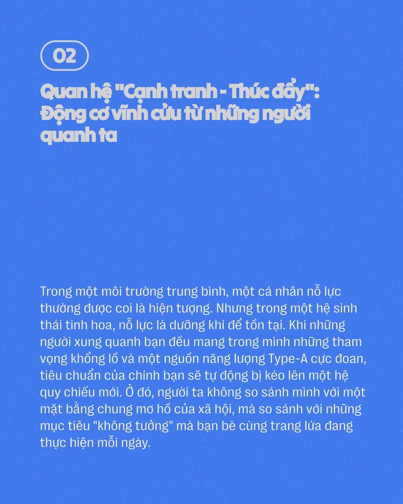 Trong một môi trường trung bình, một cá nhân nỗ lực thường được coi là hiện tượng. Nhưng trong một hệ sinh thái tinh hoa, nỗ lực là dưỡng khí để tồn tại. Khi những người xung quanh bạn đều mang trong mình những tham vọng khổng lồ và một nguồn năng lượng Type-A cực đoan, tiêu chuẩn của chính bạn sẽ tự động bị kéo lên một hệ quy chiếu mới. Ở đó, người ta không so sánh mình với một mặt bằng chung mơ hồ của xã hội, mà so sánh với những mục tiêu "không tưởng" mà bạn bè cùng trang lứa đang thực hiện mỗi ngày.