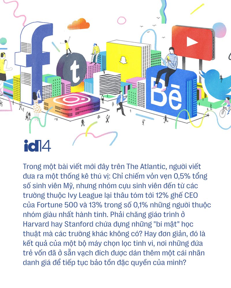 Trong một bài viết mới đây trên The Atlantic, người viết đưa ra một thống kê thú vị: Chỉ chiếm vỏn vẹn 0,5% tổng số sinh viên Mỹ, nhưng nhóm cựu sinh viên đến từ các trường thuộc Ivy League lại thâu tóm tới 12% ghế CEO của Fortune 500 và 13% trong số 0,1% những người thuộc nhóm giàu nhất hành tinh. Phải chăng giáo trình ở Harvard hay Stanford chứa đựng những "bí mật" học thuật mà các trường khác không có? Hay đơn giản, đó là kết quả của một bộ máy chọn lọc tinh vi, nơi những đứa trẻ vốn đã ở sẵn vạch đích được dán thêm một cái nhãn danh giá để tiếp tục bảo tồn đặc quyền của mình?