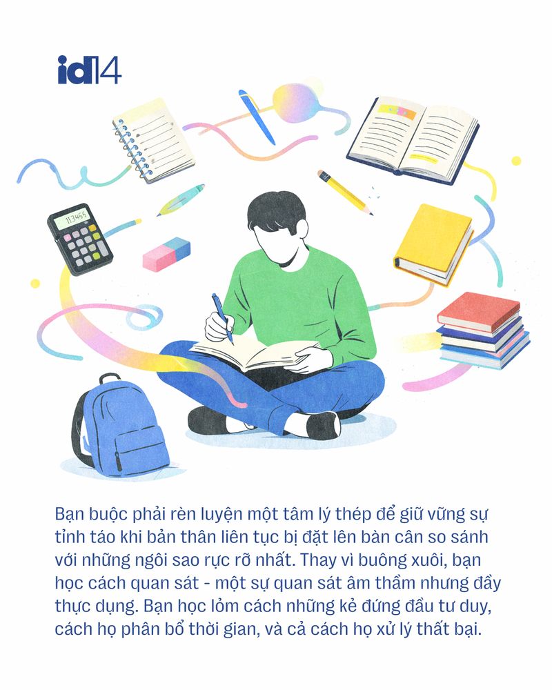 Tuy nhiên, chính trong trạng thái bị vây khốn đó, một loại bản lĩnh sinh tồn đặc biệt được hình thành. Kỹ năng quan trọng nhất mà một đứa "đứng chót lớp giỏi" học được không phải là cách để trở thành người giỏi nhất, mà là cách để không bị nghiền nát. Bạn buộc phải rèn luyện một tâm lý thép để giữ vững sự tỉnh táo khi bản thân liên tục bị đặt lên bàn cân so sánh với những ngôi sao rực rỡ nhất. Thay vì buông xuôi, bạn học cách quan sát - một sự quan sát âm thầm nhưng đầy thực dụng. Bạn học lỏm cách những kẻ đứng đầu tư duy, cách họ phân bổ thời gian, và cả cách họ xử lý thất bại.