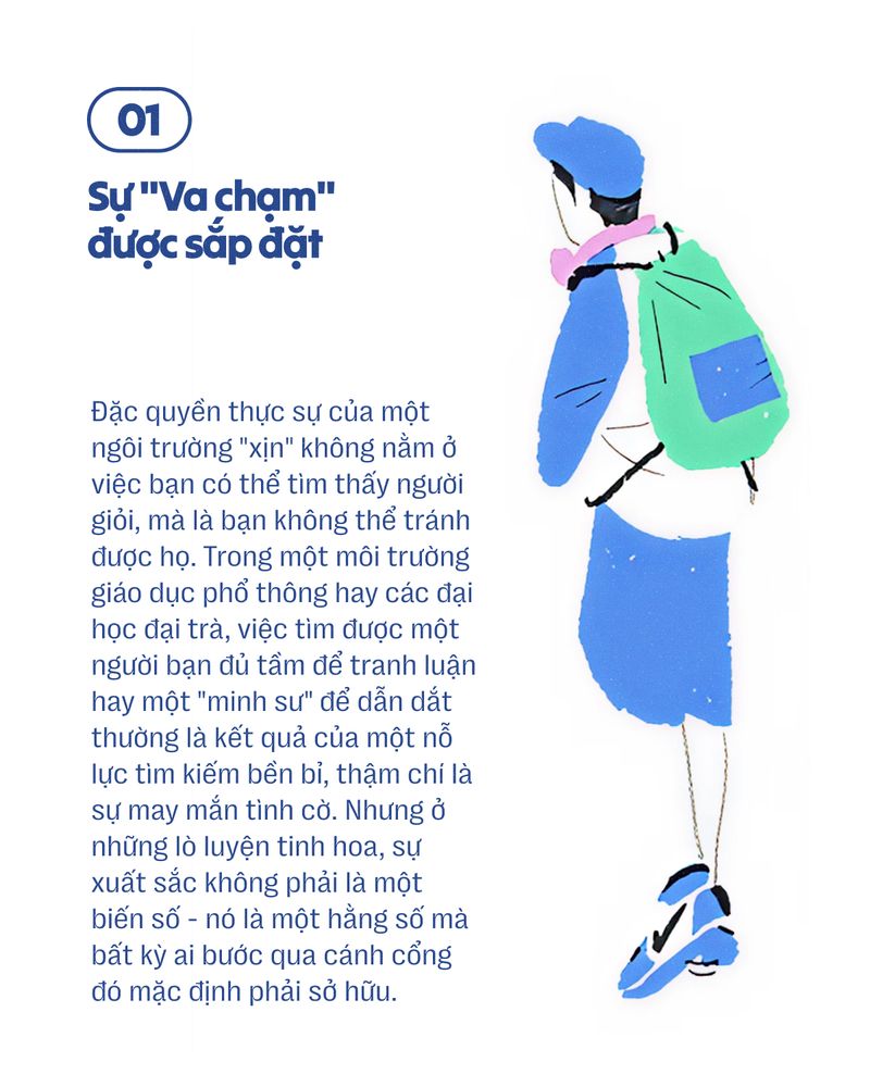 Hãy tưởng tượng về một không gian được thiết kế để tạo ra những "sự va chạm được sắp đặt". Bạn được đặt vào một môi trường mà mật độ của tham vọng đậm đặc đến mức bạn có thể chạm tay vào nó ở bất cứ đâu: Từ bàn ăn trong ký túc xá, góc quán cà phê dưới tầng hầm, cho đến những cuộc tranh biện nảy lửa trong các câu lạc bộ sau giờ học. Tại đây, đặc quyền không hiện hữu dưới dạng một danh bạ điện thoại để bạn "nhờ vả" khi cần, mà nó nằm ở việc bạn được ép phải sống chung, ăn chung và giải quyết những bài tập hóc búa nhất cùng với những kẻ tham vọng sẽ thay đổi cuộc sống.