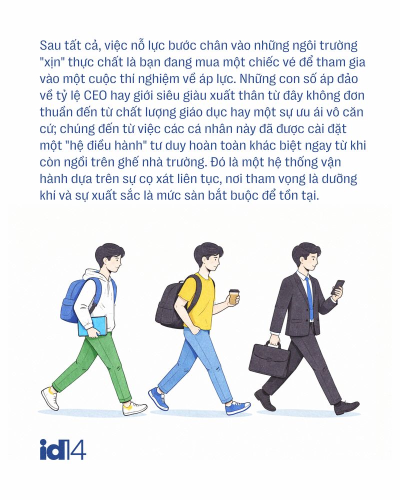 Sau tất cả, việc nỗ lực bước chân vào những ngôi trường "xịn" thực chất là bạn đang mua một chiếc vé để tham gia vào một cuộc thí nghiệm về áp lực. Những con số áp đảo về tỷ lệ CEO hay giới siêu giàu xuất thân từ đây không đơn thuần đến từ chất lượng giáo dục hay một sự ưu ái vô căn cứ; chúng đến từ việc các cá nhân này đã được cài đặt một "hệ điều hành" tư duy hoàn toàn khác biệt ngay từ khi còn ngồi trên ghế nhà trường. Đó là một hệ thống vận hành dựa trên sự cọ xát liên tục, nơi tham vọng là dưỡng khí và sự xuất sắc là mức sàn bắt buộc để tồn tại.