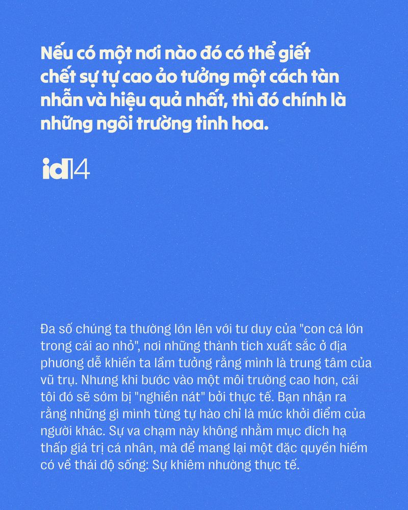 Nếu có một nơi nào đó có thể giết chết sự tự cao ảo tưởng một cách tàn nhẫn và hiệu quả nhất, thì đó chính là những ngôi trường tinh hoa. Đa số chúng ta thường lớn lên với tư duy của "con cá lớn trong cái ao nhỏ", nơi những thành tích xuất sắc ở địa phương dễ khiến ta lầm tưởng rằng mình là trung tâm của vũ trụ. Nhưng khi bước vào một môi trường cao hơn, cái tôi đó sẽ sớm bị "nghiền nát" bởi thực tế. Bạn nhận ra rằng những gì mình từng tự hào chỉ là mức khởi điểm của người khác. Sự va chạm này không nhằm mục đích hạ thấp giá trị cá nhân, mà để mang lại một đặc quyền hiếm có về thái độ sống: Sự khiêm nhường thực tế.