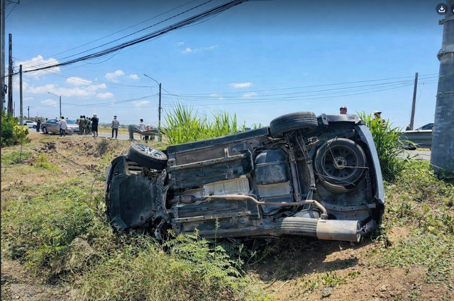 Vụ va chạm làm ô tô 5 chỗ bị lật và nhào lộn nhiều vòng, văng xuống ruộng cỏ ven quốc lộ 55. Người dân chạy tới giải cứu các nạn nhân bị mắc kẹt trong xe và đưa đi cấp cứu.