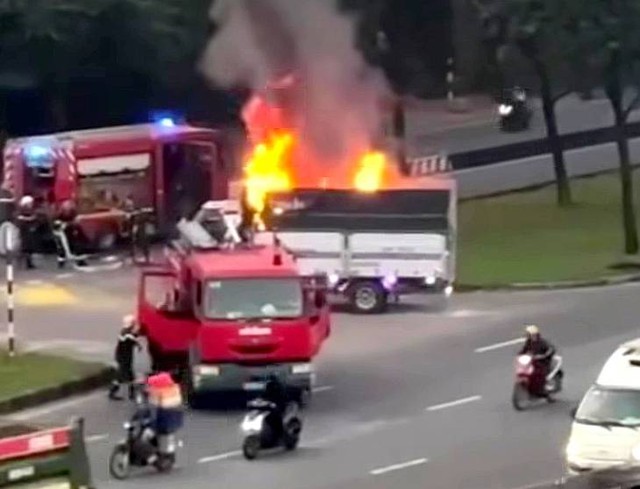 Sau 2 phút, tài xế đã đưa xe tải trong tình trạng xe vẫn bốc cháy đến ngay trước cổng trụ sở Đội chữa cháy và cứu nạn, cứu hộ khu vực 2 để nhờ hỗ trợ.