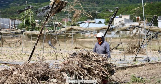 Ông Lê Văn Thắng vừa dọn lưới vườn rau tan hoang vừa nghẹn ngào: "Nhà kính 3,5 sào bị lũ cuốn trôi, ước tính mất khoảng 200 triệu đồng, còn hoa màu thì chưa biết tính sao… nhìn vườn tan tác mà lòng tôi nặng trĩu".