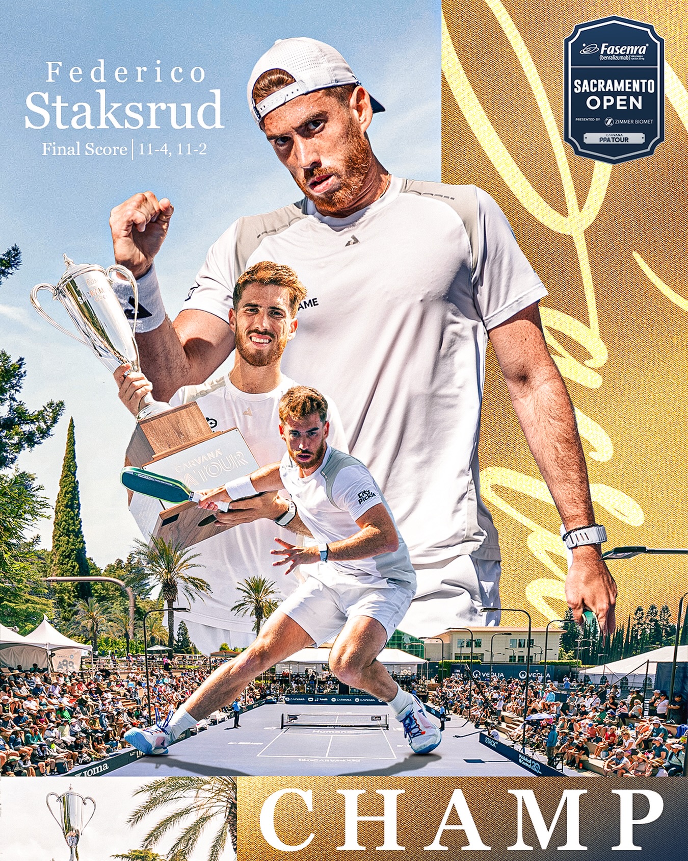 Trận chung kết đơn nam tại Sacramento Open vừa qua là màn trình diễn đơn phương của Federico Staksrud. Đối diện với Zane Ford, Staksrud đã thể hiện một lối chơi biến hóa. Chiến thắng chóng vánh với tỷ số áp đảo 11-4 và 11-2 không chỉ mang về cho anh thêm một danh hiệu danh giá trong hệ thống PPA Tour, mà còn củng cố vững chắc vị thế số 2 thế giới.