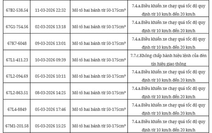 Các trường hợp phạt nguội này vi phạm tại nhiều tỉnh thành trong tháng 3/2026.