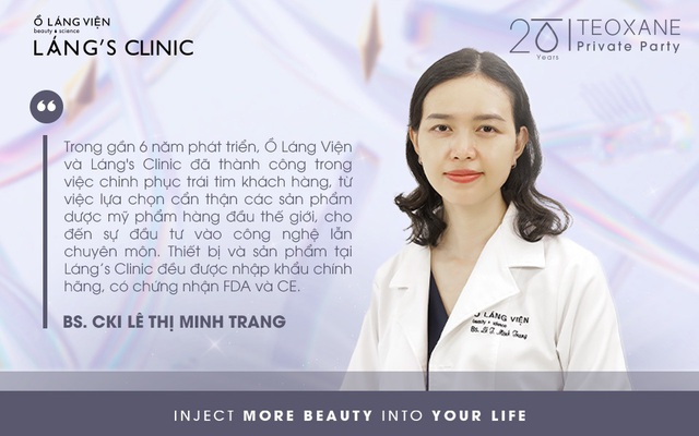 Teoxane không chỉ là một đối tác đáng tin cậy của Ồ Láng Viện và Láng's Clinic mà còn là sứ giả của vẻ đẹp tự nhiên và chăm sóc da toàn diện. Với những dịch vụ được xây dựng song hành cùng sản phẩm Teoxane, khách hàng tại Láng's Clinic không chỉ được chăm sóc bởi đội ngũ bác sĩ chuyên nghiệp mà còn được trải nghiệm dịch vụ cùng thương hiệu hàng đầu.