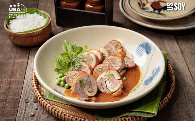 Phần đùi tỏi gà Mỹ được lọc xương, giữ nguyên độ dày và độ ngọt tự nhiên, cuộn cùng nhân nấm đông cô, cà rốt và đậu Hà Lan băm nhuyễn. Khi hấp chín và áp chảo nhẹ, thịt gà vẫn mềm mọng, thấm đều hương vị. Kết hợp cùng xốt cà ri béo thơm, dịu ấm, món ăn đạt được sự hài hòa về màu sắc, hương vị và dinh dưỡng – dễ ăn, đậm đà nhưng không gây ngấy, phù hợp với nhiều thế hệ trong gia đình ngày Tết.