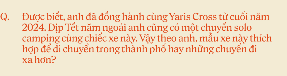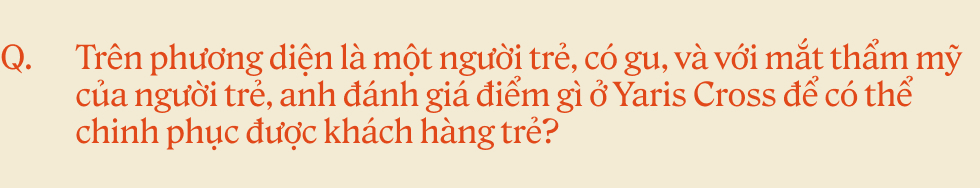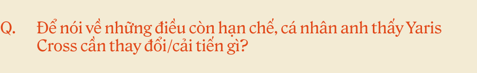 Thú thật là trước đây Cơ không mặn mà với thiết kế của Toyota lắm. Nhưng chiếc Yaris Cross này làm mình thay đổi sau khi được trải nghiệm thử hồi đầu năm 2024. Mình thích cái cách nó không bị quá là hầm hố, mà vẫn có sự sắc sảo, gọn gàng. Cảm giác lái con này đi gặp bạn bè hay đi date, phản ánh được cái gu hiện đại của người cầm lái.