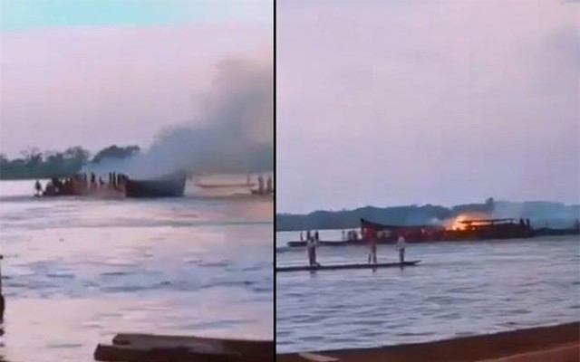 Một số hình ảnh và video được chia sẻ trên mạng xã hội cho thấy một chiếc thuyền dài bốc cháy và khói, trong khi những người trên các tàu nhỏ hơn đứng nhìn.