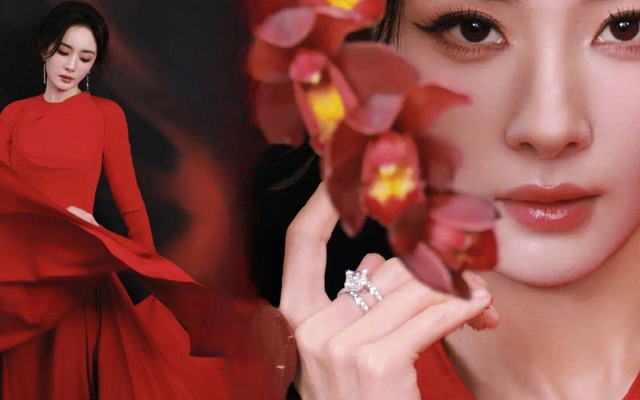 Không cần tạo dáng cầu kỳ, Dương Mịch chỉ cần thả lỏng cơ thể, để mặc cho tà váy đỏ rực rỡ hòa quyện vào bóng hoa, tạo nên một khung cảnh vừa thực vừa mơ. Điểm xuyết trên nền nhung đỏ quyền lực ấy là ánh sáng lạnh của những viên kim cương lấp lánh, tựa như những vì sao vụn vỡ rơi xuống trần gian, vương vấn trên người mỹ nữ.