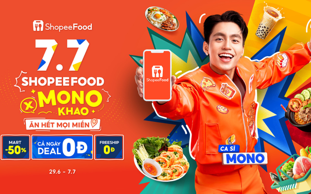 Chàng đại sứ MONO sẽ mang đến thật nhiều ưu đãi hấp dẫn để bạn có thể "chinh chiến" ẩm thực khắp mọi miền đất nước tại sự kiện ShopeeFood 7.7.