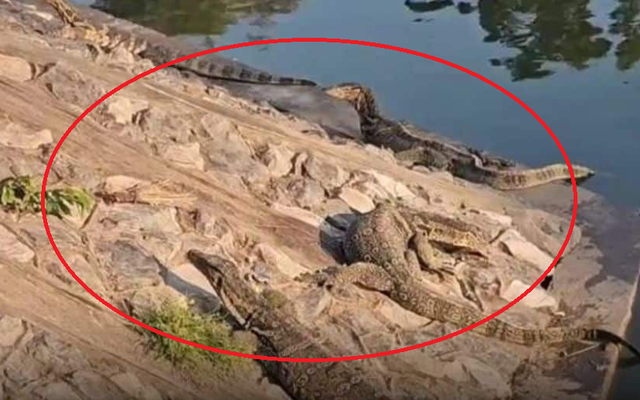 Những con kỳ đà nước khổng lồ xuất hiện ở một hào nước, khiến người dân sợ hãi.