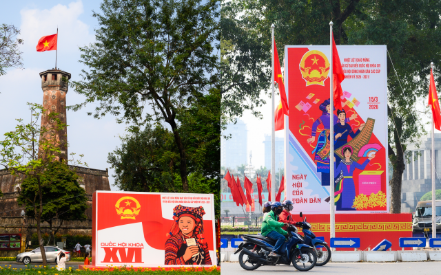 Những ngày đầu tháng 3, nhiều tuyến phố ở Hà Nội rực rỡ cờ Tổ quốc, pano và khẩu hiệu tuyên truyền, tạo không khí sôi nổi hướng về Cuộc bầu cử đại biểu Quốc hội khóa XVI và đại biểu HĐND các cấp nhiệm kỳ 2026–2031.