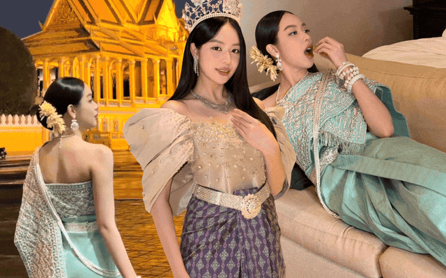Nàng Hậu cũng nhanh chóng hoá thân thành người con gái bản địa với bộ sampot màu xanh ngọc ánh bạc, được thêu tay tinh xảo và điểm xuyết bằng những chuỗi hạt ngọc trai cùng hoa tai bản lớn. Từng chi tiết từ kiểu búi tóc chải bóng, đóa hoa vàng cài lệch sau tai đến lớp trang điểm nhẹ trong veo đều gợi hình ảnh người phụ nữ Khmer duyên dáng, nền nã nhưng vẫn sang trọng.