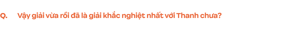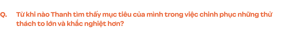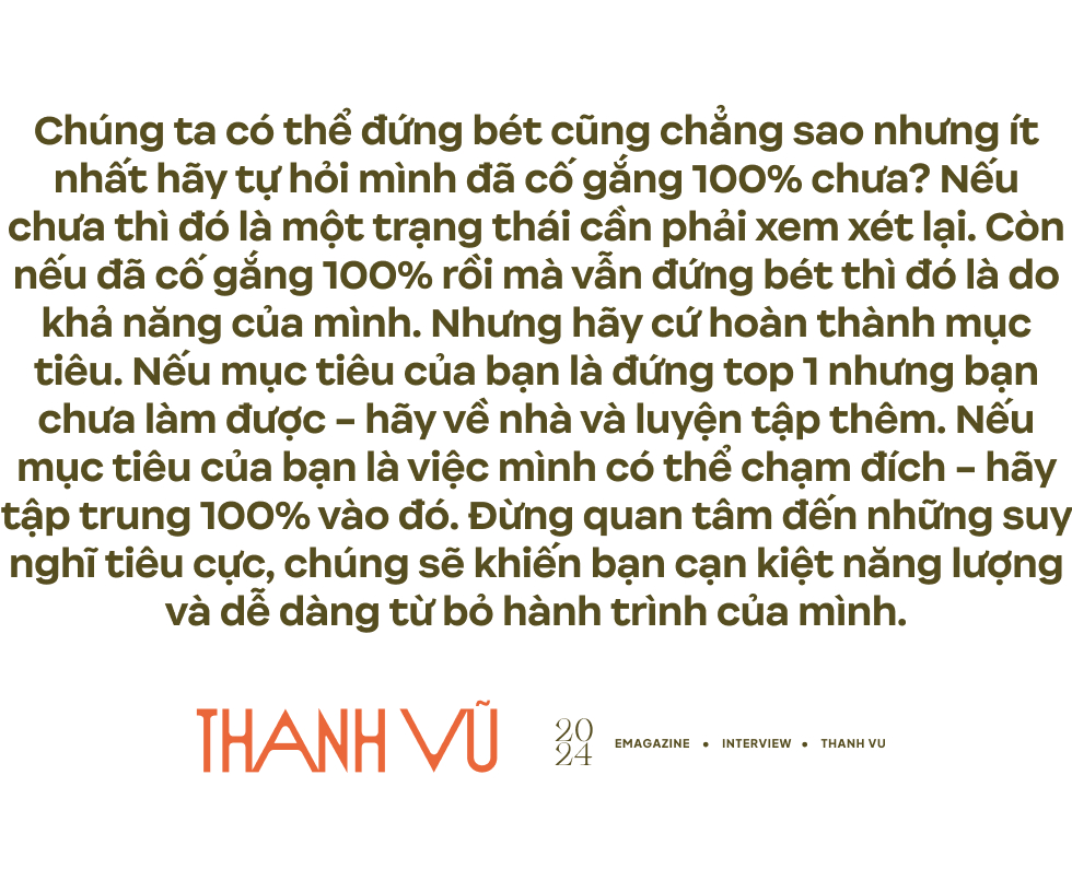 Thanh nghĩ, đây là một mục tiêu không đích đến. Tôi không thể nói được rằng mình đã làm được bao nhiêu phần trăm, chỉ biết rằng mình đã bước vào trận được đâu đó 10 năm rồi, và còn rất nhiều 10 năm nữa. Cho đến khi đặt đầu xuống đất, tôi vẫn giữ vững được tinh thần như vậy thì tôi tin rằng khi đó là lúc mình chạm đích.