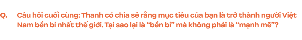 Bền bỉ là tính cách, là phẩm chất, là thứ khiến tôi có thể sống cuộc đời này tốt hơn. Tôi biết mình không mạnh. Mạnh mẽ có nghĩa là cứng rắn, là không được yếu đuối. Trong giải chạy, tôi khóc suốt. Nhưng bền bỉ là khi bạn ngã xuống và bạn vẫn đứng lên, khóc nhưng vẫn giữ cái đầu lạnh để lên chiến lược đi tiếp.